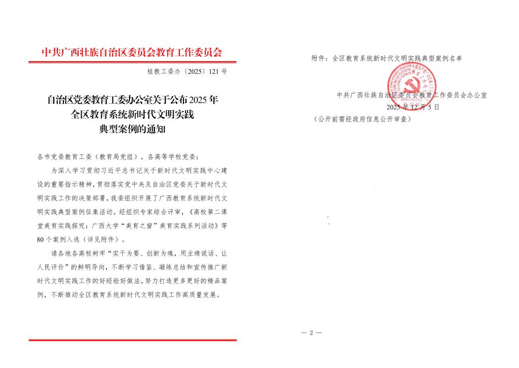 据悉,本次评选经过专家严格评审,最终从全区教育系统遴选出的80个典型案例,涵盖各高校及各教育工委,集中展示了广西教育系统在新时代文明实践工作中的创新实践和丰硕成果。